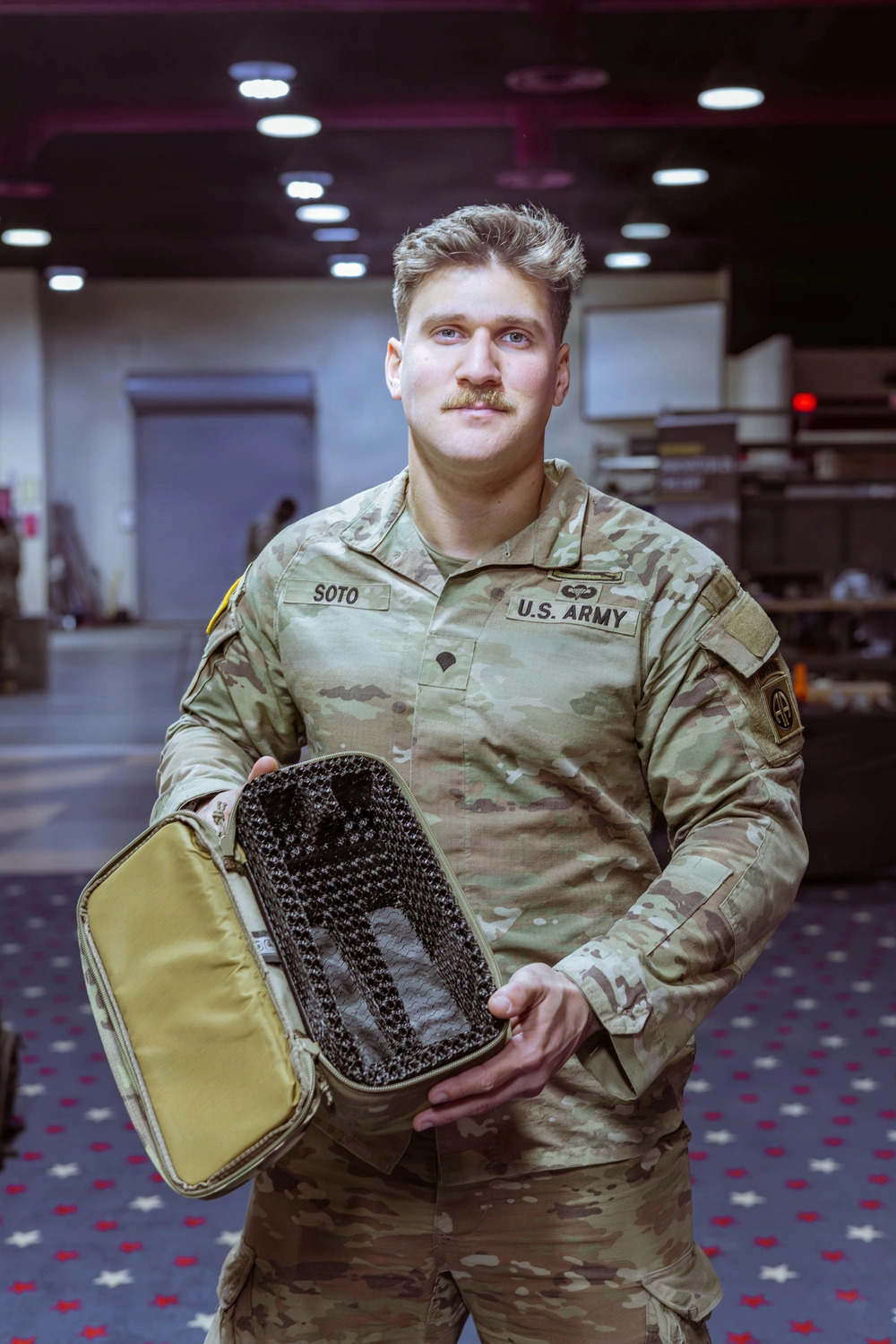 Spc. Alexander Soto, a paratrooper assigned to the 1st Battalion, 504th Parachute Infantry Regiment, presents the modular drone case at the Airborne Innovation Lab, Fort Bragg, North Carolina, Feb. 9, 2026. Soto noted the recurring problem of drones