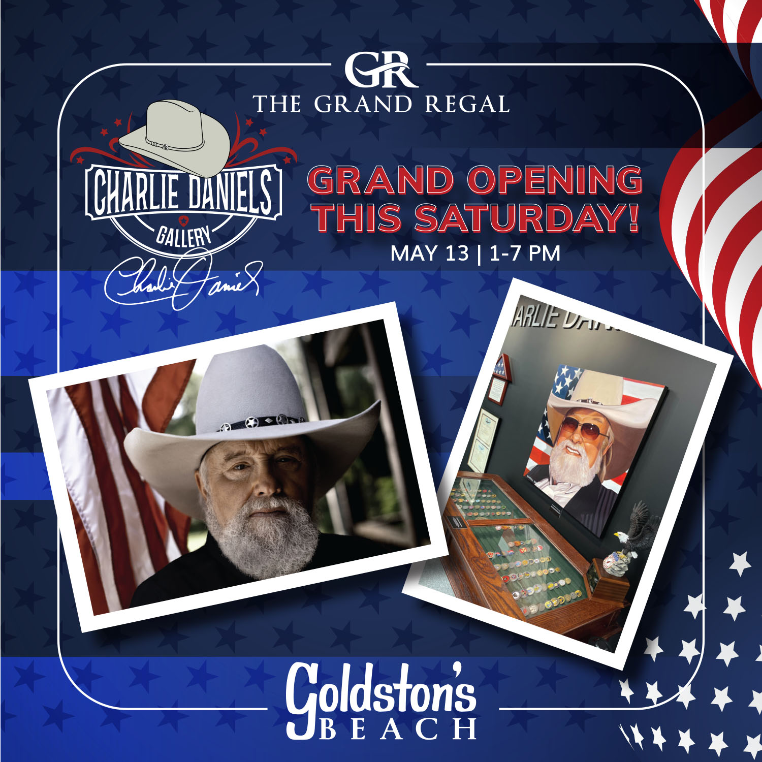 Photo courtesy of The Grand RegalThe Elizabethtown-White Lake Area Chamber of Commerce is pleased to work with The Grand Regal to announce the grand opening and ribbon cutting of the Charlie Daniels Gallery at Goldston’s Beach on May 13. There will b ...