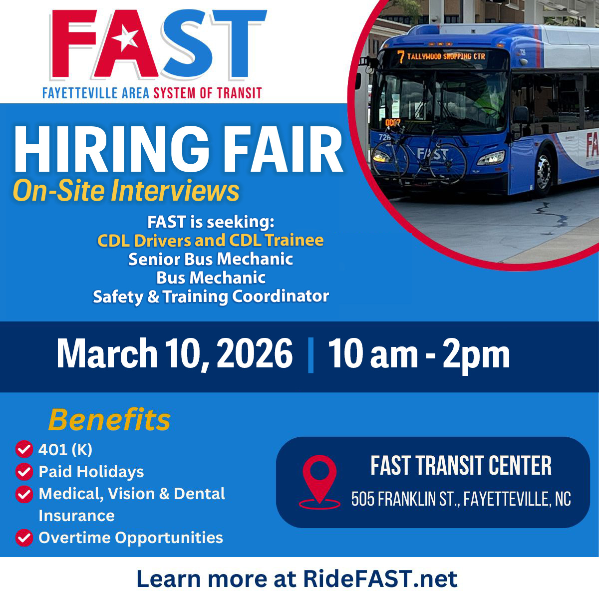 Fayetteville Area System of Transit (FAST) will host a hiring fair on Tuesday, March 10 from 10 a.m. to 2 p.m. at the FAST Transit Center, 505 Franklin Street. FAST is currently hiring for helpful, service-oriented people. Those interested ...